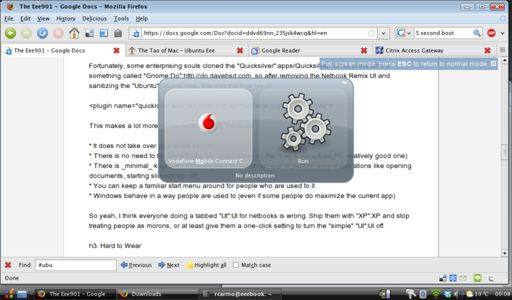 Fortunately, some enterprising souls cloned the Quicksilver UI in the form of something called Gnome Do, so after removing the Netbook Remix UI and sanitizing the Ubuntu look, this was the final result:
