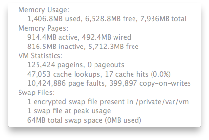 Things were positively zippy, and, most noticeably, my battery life was dramatically extended (undoubtedly due to the utter lack of virtual memory and swapfile usage).