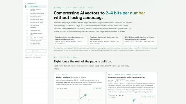 An interactive, beautifully executed walkthrough of vector quantization – compressing the KV caches and embedding tables that make modern language models so expensive to run, down to 2–4 bits per number without meaningful accuracy loss. The kind of thing that makes you wish more people explained dense technical material this way: live sliders, animated diagrams, intuition built up incrementally before the math arrives. Bravo.